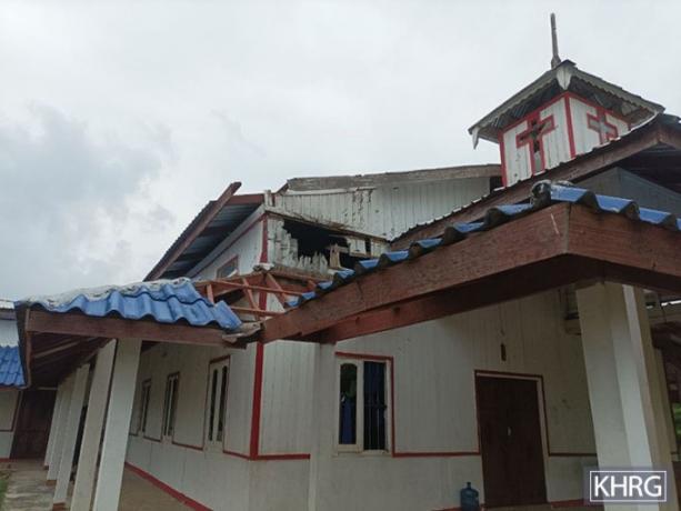 This photo was taken in April 2023 in Meh Wah village, T’Naw Th’Ree Township, Mergui-Tavoy District. It shows a church building damaged by SAC shelling during fighting between SAC and PDF-KNLA combined forces between April 27th and 29th 2023. [Photo: KHRG]