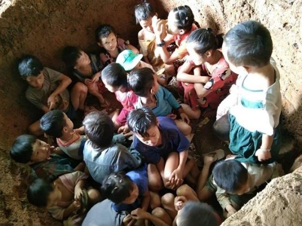 This photo was taken on August 15th 2023 in Cw--- village, Ma Htaw village tract, Dwe Lo Township, Mu Traw District. This photo shows Kyo Hkee students hiding in a bunker in fear during SAC shelling in the village. [Photo: Local villager]