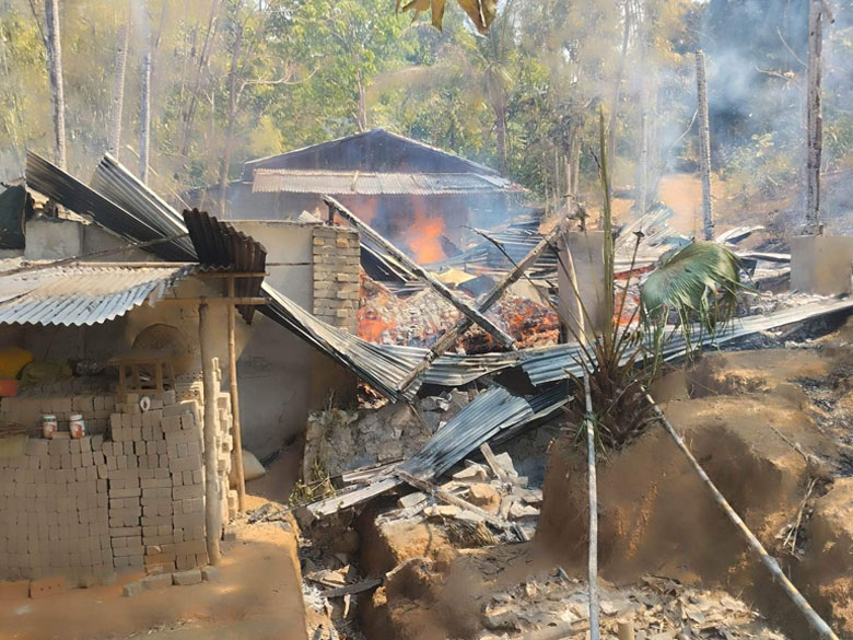 On February 21st 2023, in search of People’s Defence Force (PDF)[14] members in the aftermath of fighting in the area, SAC soldiers from Light Infantry Battalion (LIB)[15] #603, led by Battalion Commander Hein San Htun, entered T’Hsee Theh Mee Lar Town, Than Tuang Way Thaw area, in Taw T’Htoo Township, Taw Oo District. The SAC soldiers arrested eight villagers who were taken to Than Taung police station, in Than Taung Town, where they were interrogated, beaten and punched. The SAC soldiers burned villagers’ houses and confiscated villagers’ belongings, including clothes and five motorcycles, which they burned altogether.
