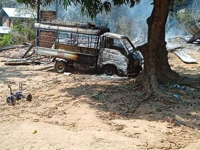 These photos were taken on 21st February 2023 in T’Hsee Theh Mee Lar Town, Thandaung Way Thaw area, Taw T’Htoo Township, Taw Oo District. They show the village after SAC soldiers burned houses, cars and other property belonging to villagers, on that same day. [Photos: local villager]