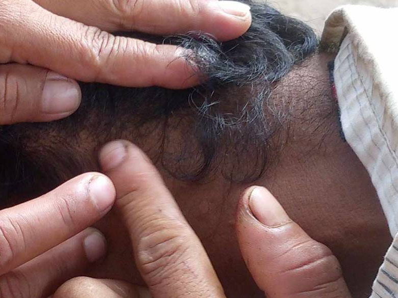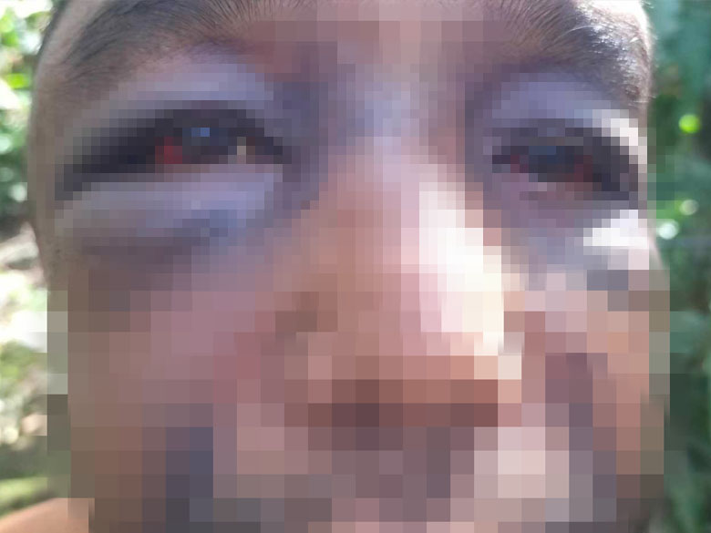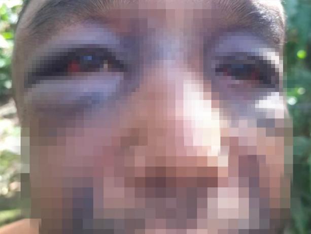 These photos were received on October 27th 2023. They show villagers from Sa--- village, Meh Naw Aah village tract, Kaw T’Ree Township, Dooplaya District, who were arrested as human shields and forced to travel together with SAC soldiers from LID #44, on October 26th 2023. While marching the younger villager was beaten and punched in the face by the soldiers (top-left photo). As the SAC soldiers encountered KNLA troops on the way, fighting broke out and two of the villagers were injured on the back of the head (bottom-left) and back (top-right). The villagers were released only after they were injured by the fighting. [Photos: local villager]