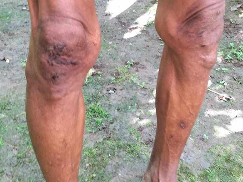 These photos were received from a local leader two days after the incident of torture. These photos show U C---, a 50-year-old villager from Ca--- village, K’Leh T’Kon Teh village tract, Waw Ray Township, who was arrested and tortured by the SAC soldiers when he returned to his village to feed his pigs, on September 18th 2023. [Photos: local leader]