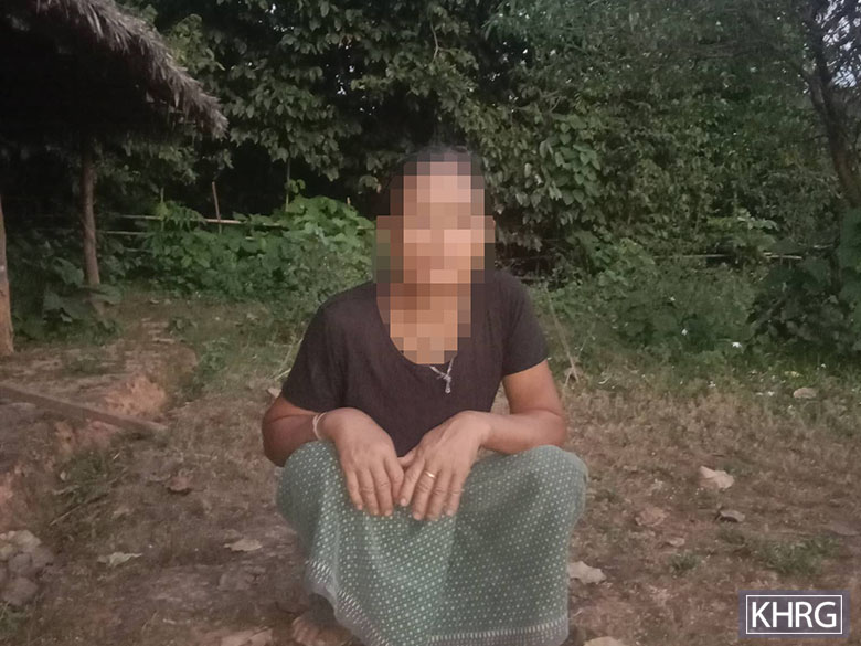 This photo was taken on November 27th 2023 in Oa--- village, Ma Htaw village tract, Dwe Lo Township, Mu Traw District. It shows Naw P---, a female villager who was arrested by SAC soldiers, interrogated, and tied up all night in a forest, after being arbitrarily arrested at her farmland while herding buffaloes. [Photo: KHRG]