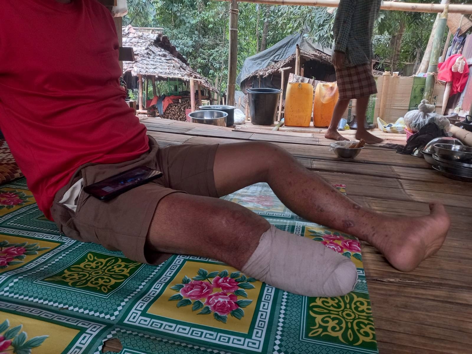 This photo was taken on January 9th 2024 in B--- village, Htaw Wah Law village tract, Kaw T’Ree Township, Dooplaya District. It shows a displaced villager, Maung A--- from Kyeikdon Town, Kaw T’Ree Township, whose right leg had to be amputated after being struck by a landmine explosion. On December 7th 2023, Maung A--- stepped on a landmine when he returned to check his house in Kyeikdon Town. He had fled from the town due to SAC shelling in November 2023. After the incident, he was sent to U--- Hospital in Thailand, for medical treatment. [Photo: KHRG]