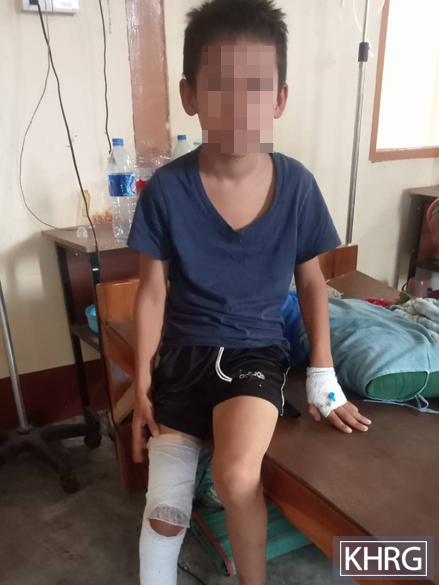 On November 4th 2023 [in the morning], fighting broke out between State Administration Council (SAC)[6] soldiers [unknown battalion] against combined forces from People’s Defence Force (PDF)[7] and Karen National Liberation Army (KNLA)[8] in Kawkareik Town, Kaw T’Ree Township, Dooplaya District. At around 10 am, the SAC conducted an air strike [and one bomb landed] inside E--- section, Kawkareik Town. [At the time,] Saw A--- (11 years old), a Grade-3 [primary school] boy, was with his grandmother [in their house in E--- section], and went outside of the house to urinate. While he was urinating, he was hit by shrapnel [from a bomb] on the right calf. His grandmother heard him being wounded by the shrapnel and immediately called his parents, who sent him [by car] to a hospital in Hpa-an Town, Hpa-an District [located one hour away] to receive treatment. When he reached the hospital, he had very low blood pressure [due to blood loss], thus it could not be predicted whether he would live or not. Saw A--- received treatment on time and was saved. [His parents paid for the treatment themselves, and did not receive assistance from any organisations]. By November 30th 2023, his wound was not fully healed, so he received further treatment at C--- clinic, in Naw Kwaw village tract, Ta Kreh (Paingkyon) Township, Hpa-an District. [C--- clinic is under the Karen Department of Health and Welfare (KDHW)[9], so treatment was free of charge.] Regarding the incident, his mother expressed: “In this political situation, it is not convenient to work. Our financial situation is becoming more difficult. It’s really sad to witness my son experience it [the attack].”