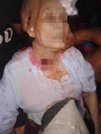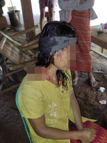 This photo was taken on October 19th 2023 in E--- village, Hsaw Thu Hkee village tract, Kyeh Htoh Township, Doo Tha Htoo District. On that day, mortar shells were fired by SAC Light Infantry Battalion (LIB) #2, from Thaton Town army camp, based at Let Pan Pin temporary camp in E---. This photo shows a villager named Naw[6] F--- who was seriously injured by shrapnel on her head while she was in her village. [Photo: Local villager]