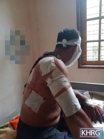 This photo was taken on October 18th 2023 in Am--- village, Pyu special area, Moo Township, Kler Lwee Htoo District. This photo shows one of the four injured villagers from An--- village, Pyu special area, accessing medical treatment. He was injured by mortar shelling conducted by SAC LIB #307, in Am--- village, on October 17th 2023. LIB #307 is based in Shwe Wa army camp. [Photo: KHRG]