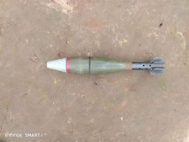 This photo was taken in September 2023 in Bk--- village, Kleh Mu Htee area, K’Hser Doh Township, Mergui-Tavoy District. It shows an unexploded mortar round, shelled by SAC soldiers on September 23rd 2023 during fighting with local PDF. Village leaders informed local KNU authorities and asked them to remove this UXO. Villagers do not feel secure to work on their farms and plantations because of the increase of UXO contamination in the community. [Photo: Local villager]