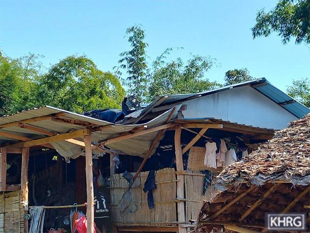 This photo was taken on November 28th 2023 in Aa--- village, Day Lo Mu Nu area, Htaw Ta Htoo Township, Taw Oo District. It shows the roof of a house damaged by SAC IB #39 shelling of mortar rounds in Aa--- village, on November 19th. The mortar explosion damaged three other houses in the same village[13]. [Photo: KHRG]