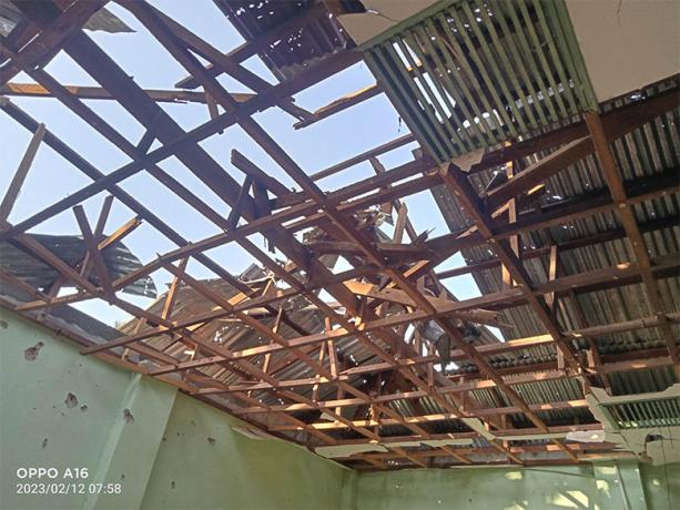 This photo was taken on December 24th 2023 in Aq--- village, Hsaw Htee Township, Kler Lwee Htoo District. It shows the roof of the monastery building destroyed by the explosion of 120mm mortar rounds shelled by SAC LIB #20, based in Nyaunglebin Town army camp, on December 12th 2023, at 10:40 am. The SAC troops indiscriminately shelled three mortar rounds toward Aq--- village; two of them landed near Aq--- village and the other one landed on Aq--- monastery building, destroying the monastery roof and the Buddha statue. [Photo: KHRG]