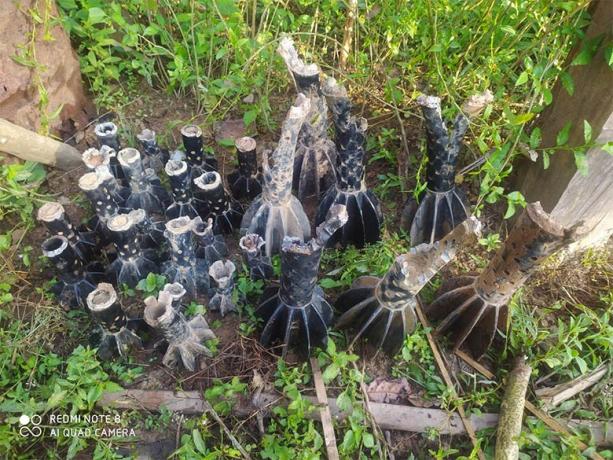 KHRG received this photo on November 27th 2023. It was taken in By--- village, Ma Htaw village tract, Dwe Lo Township, Mu Traw District, and shows some of the remaining fins from mortar rounds shelled by the SAC troops, after explosion. The remnants were collected by local villagers. [Photo: Local villager]