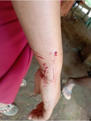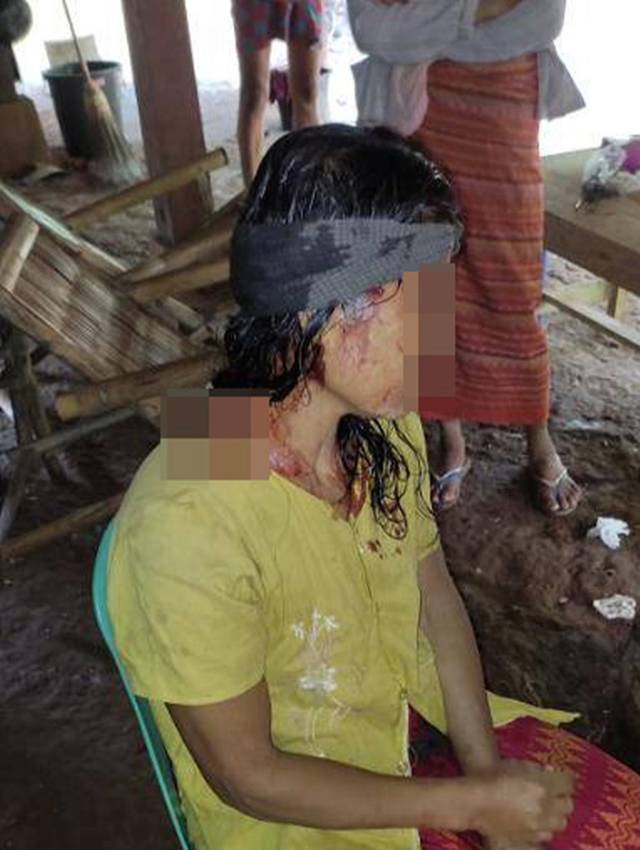These photos were taken in October 2023, in C--- village, Nghet Pyaw Taw village tract, Kyeh Htoh Township, Doo Tha Htoo District. The photo on the left shows a villager named Naw G--- and the photo on the right shows a villager named Naw E---, who were injured by mortar shelling conducted by SAC Light Infantry Battalion (LIB) #2, from Thaton Town army camp, based at Let Pan Pin temporary camp, in C--- village. [Photos: Local villager]