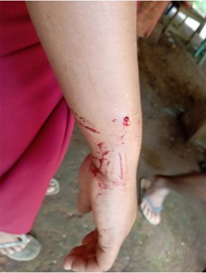 While Saw D--- was being treated at the hospital, he received a total of 150,000 kyats [71.33 USD][8] in cash from [two] local humanitarian groups. After this incident, Saw D--- expressed: “It will be better if they [SAC soldiers] don’t conduct shelling like this again. Then, the villagers will live peacefully. Now, we dare not sleep as we don’t know when they will conduct shelling”. He added: “Since I was injured, I have not been able to work, and it causes challenges for my livelihood”. |