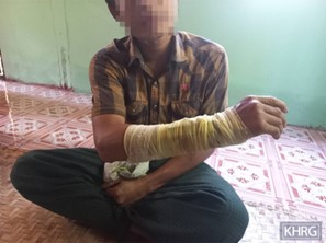 This photo was taken in February 2024, in C--- village, Nghet Pyaw Taw village tract, Kyeh Htoh Township, Doo Tha Htoo District. The photo shows a villager named Saw D--- who was injured by mortar shelling conducted by SAC Light Infantry Battalion (LIB) #2, from Thaton Town army camp, based at Let Pan Pin temporary camp, in C--- village. [Photo: KHRG]