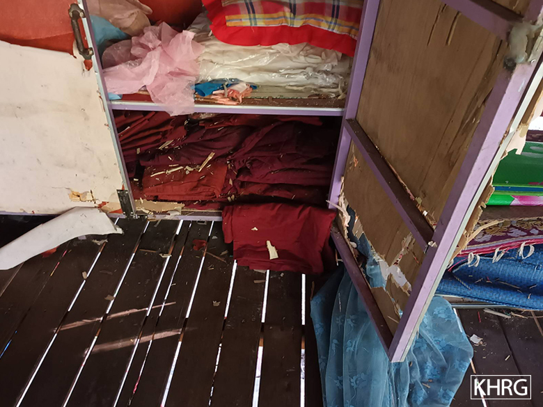 These photos were taken on January 10th 2024, in C--- village, Raw Keh village tract, Kruh Tuh Township, Dooplaya District. These photos show the monastery buildings damaged by SAC mortar shells on December 28th 2023. The photos on the top row show a cupboard in the monastery to store clothes (left) and the ordination hall (right). The photos on the bottom row show the pagoda area (left) and the dormitory for nuns (right). [Photos: KHRG]