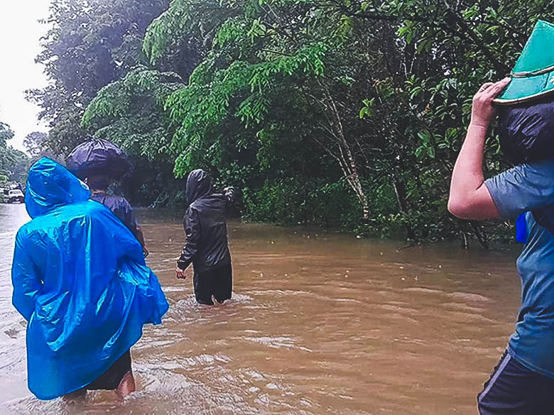 This photo was taken in July 2024 in Bh--- village, Bh--- village tract, Kaw T’Ree Township, Dooplaya District. After conducting a documentation training with local villagers in Bx--- village, Bz--- village tract, Kruh Tuh (Kyonedoe) Township, Dooplaya District, in July 2024, five HRDs were traveling back home through a safer route to avoid the SAC. On their way, they found the area heavily flooded as it was rainy season, hindering their travelling. [Photo: Local HRD]