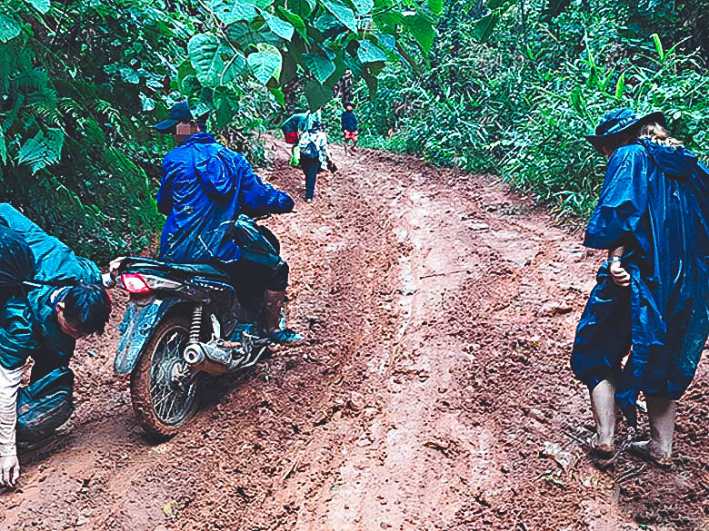 This photo was taken in May 2024 in K’Ser Doh Township, Mergui-Tavoy District. It shows several HRDs travelling to conduct a human rights awareness workshop. To avoid SAC checkpoints, they travelled through forest roads, which became very muddy as it was the beginning of the rainy season. [Photo: local HRD]