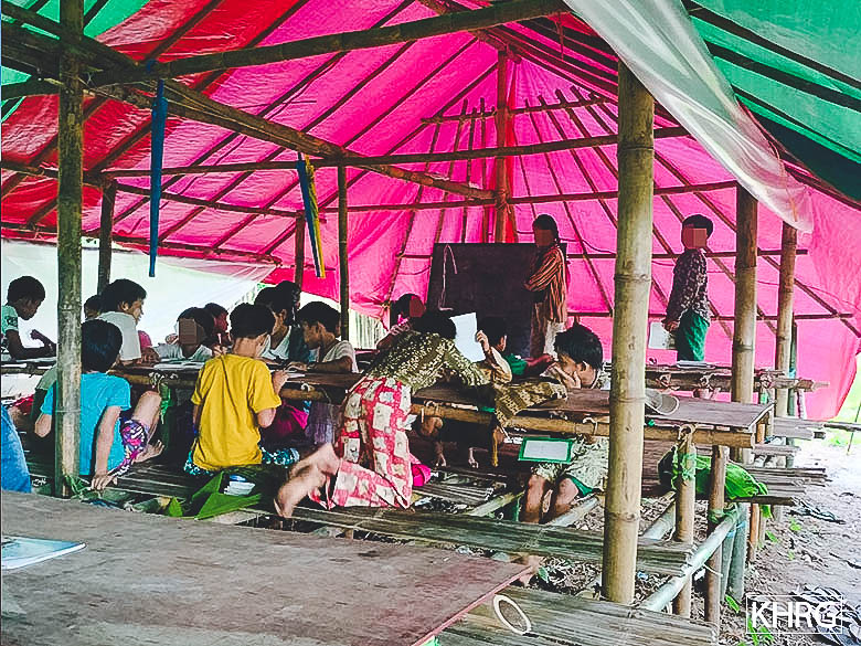 This photo was taken in September 2023 in a forest in Saw Mu Plaw village tract, Lu Thaw Township, Mu Traw District. Students and teachers from Bu--- primary school in Saw Muh Plaw village tract, did not feel safe attending the village school due to an SAC air strike and fled to a forest. The photo shows a teacher (on the right, wearing a yellow t-shirt) providing education to displaced children in a makeshift shelter. [Photo: KHRG]