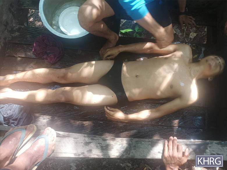 These photos were taken in K--- village, Hter Wa Law village tract, Kaw T’Ree Township, Dooplaya District in May 2024. The left photo shows villagers preparing Saw Htoo Ler’s body for burial on May 20th 2024. The right picture shows Saw Htoo Ler’s body on a road near a pile of casava trunks. Saw Htoo Ler was shot dead in a hut near Ler Klaw village, Hter Wa Law village tract, by SAC soldiers, when he was trying to ran away from them. [Photos: Local villager]