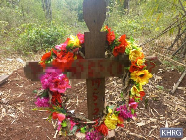 These photos were taken on May 19th and 21st 2024, respectively. The left photo shows Naw G---’s body, who was shot dead by SAC LIB #557, #339 and #311 soldiers at Ler Klaw village, Hter Wa Law village tract, Kaw T’Ree Township, on May 19nd 2024. The right photo shows her wooden grave marker in F--- village, Hter Wa Law village tract. [Photos: local villager]