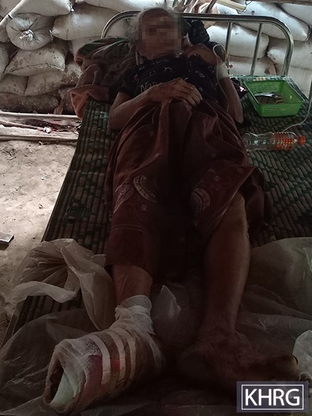 These photos were taken on April 21st 2024 in C--- monastery, M--- foothill, Meh Th’Na village tract, Hpa-an Township, Doo Tha Htoo District. These photos show an 85-year-old grandmother and her 12-year-old granddaughter who were injured by an SAC air strike conducted on the evening of April 20th 2024. Two small bombs hit the monastery in C--- village, injuring the two villagers who hid under some trees outside when hearing aircraft reconnaissance. The granddaughter was injured on her right arm and her grandmother was injured on her right foot, cutting three of her toes, and injuring her left foot and the left side of her neck. [Photos: KHRG]