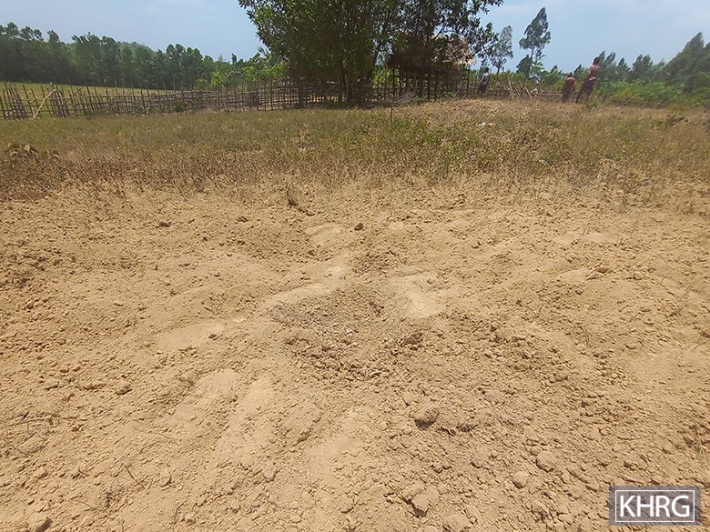 Then, four bombs [from the SAC] were dropped onto a farm [located close to C--- Monastery] owned by a 60-year-old villager, named Saw L---, from G--- village, in Meh Th’Na village tract. Among those four [bombs], one [bomb] landed inside the buffalo’s fence [but no buffalo were injured]. Saw L--- had planted sugar cane, rambutan plants, and paddy in his farm. Saw L--- explained [to KHRG]: “I just would like to say: how [are we going] to do [deal] with those shrapnel [from the bombs dropped]? Should we hide it in a safe place? It might cut our legs and hands. We cannot collect them [shrapnel] all.” As the bombs landed and exploded on Saw L---’s farm, he was worried that his hands and legs would be injured by shrapnel while doing cultivation on his farm. His farm is located in M--- foothill, the same as C--- Monastery, in Meh Th’Na village tract.