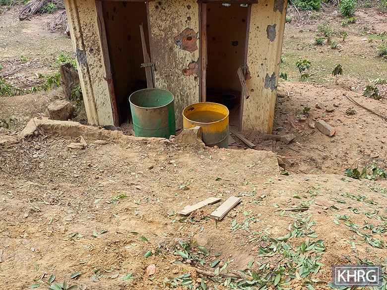 These two photos were taken on April 21st 2024, near C--- Monastery in Meh Th’Na village tract, Hpan-an Township, Doo Tha Htoo (Thaton) District. On April 20th 2024, an SAC aircraft dropped four bombs on Saw L---’s farm, located close to C--- Monastery, and two bombs on C--- Monastery in Meh Th’Na village tract. The photo on the left shows a crater in the ground caused by an SAC air strike that landed inside Saw L---’s buffalo fence. The photo on the right shows a two-room attached toilet located outside C--- Monastery that was damaged by the SAC air strike. [Photos: KHRG]