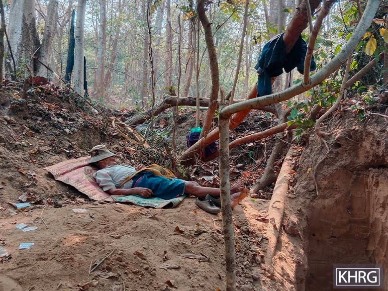 These photos were taken in March 2024, at Bq--- place near Br--- village, Meh Nyuh village tract, Bu Tho Township. These photos show displaced villagers from Bp--- village, Meh Nyuh village tract, who were hiding from SAC air strikes in a bunker. On March 15th 2024, KNLA combined with PDF troops attacked an SAC military camp in Pah Pu Town, Bu Tho Township. Following the attacks, SAC aircraft patrolled over area and conducted air strikes in an area 20 miles (32 kilometres) far from the town, so villagers were afraid and fled to the jungle. [Photos: KHRG]