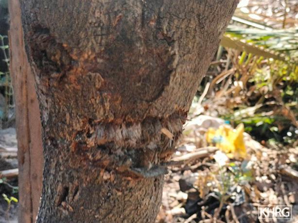These photos were taken in December 2024 in A--- village, Way Htoo village tract, Daw Hpah Hkoh Township, Taw Oo District. On December 11th 2024, the SAC dropped three bombs on the village by using a drone, which killed a villager named U C---, injured a cow, and damaged two houses and some trees. The top left photo shows a big hole in front of U C---’s niece’s house, caused by one of the bomb’s explosions. The top right photo shows that the roof of U C---’s niece’s house was damaged by the shrapnel of the bomb. The two photos on the bottom row show some trees, owned by local villagers, damaged by the shrapnel of the bomb. [Photos: KHRG]