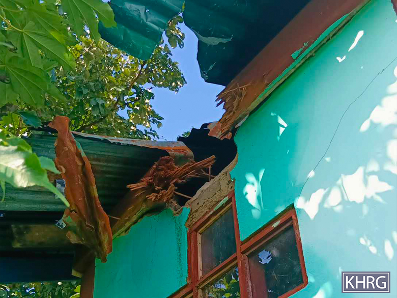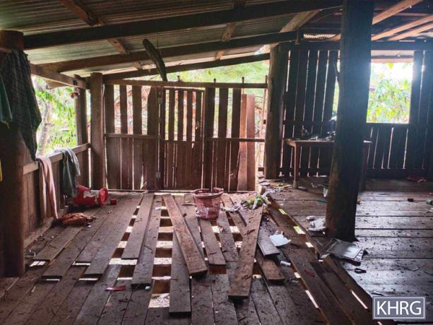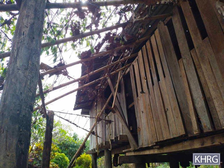 These photos were taken in November 2023 in C--- village, K’Ser Hpoh village tract, Waw Ray Township. On November 27th 2023, SAC soldiers stationed in K’Neh army camp, Kaw T’Ree Township, shelled mortar rounds into C--- village, damaging three houses. These photos show the damage to houses. [Photos: KHRG]