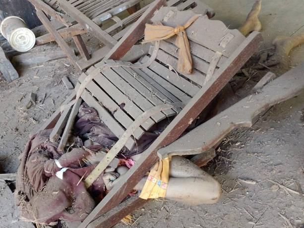 These photos were taken in December 2023. On December 1st 2023, at 2 am, SAC aircraft dropped two bombs on Aa--- village, Meh Theh village tract, Kruh Tuh (Kyonedoe) Township, Dooplaya District, injuring a monk named U Z--- on his abdomen and head, killing him instantly. The photo on the top-left displays the foldable wooden chair that collapsed on top of the monk, when hit by the bomb. The photo on the top-right shows the injuries sustained by U Z--- on the head and back. The photo on the bottom-left shows villagers measuring the bombed area: the width was 17 feet (5.18 meters) and the depth was nine feet (2.7 m). The photo on the bottom-right shows the monastery that was damaged due to the SAC air strike. [Photo: local villager/KHRG]