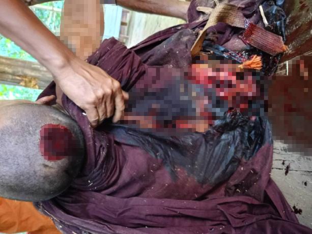 On the same day, at 2 am, an SAC jet dropped two 500-pound bombs on a monastery in Aa--- village, Meh Theh village tract, killing a monk named U Z--- (32 years old), who was not from Aa--- village but he was visiting Aa--- village for a Buddhist Festival, ‘Kahtin Pwe’[17].The bomb landed nearby the monastery. When the bomb exploded, the monk was sitting on a wooden foldable chair inside the monastery, the chair collapsed and he was injured on his abdomen and his head and died on the spot. On the next morning villagers found the monk in the monastery and prepared to bury him. The bomb explosion also damaged the temple.