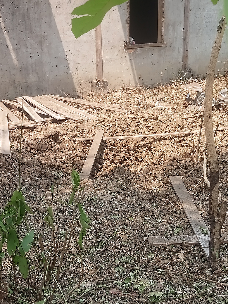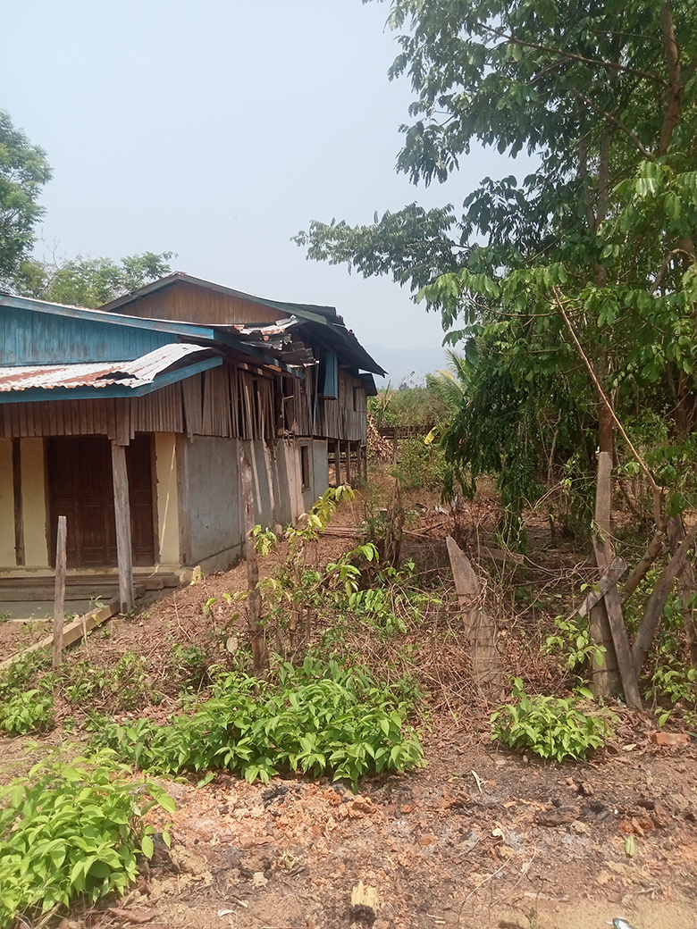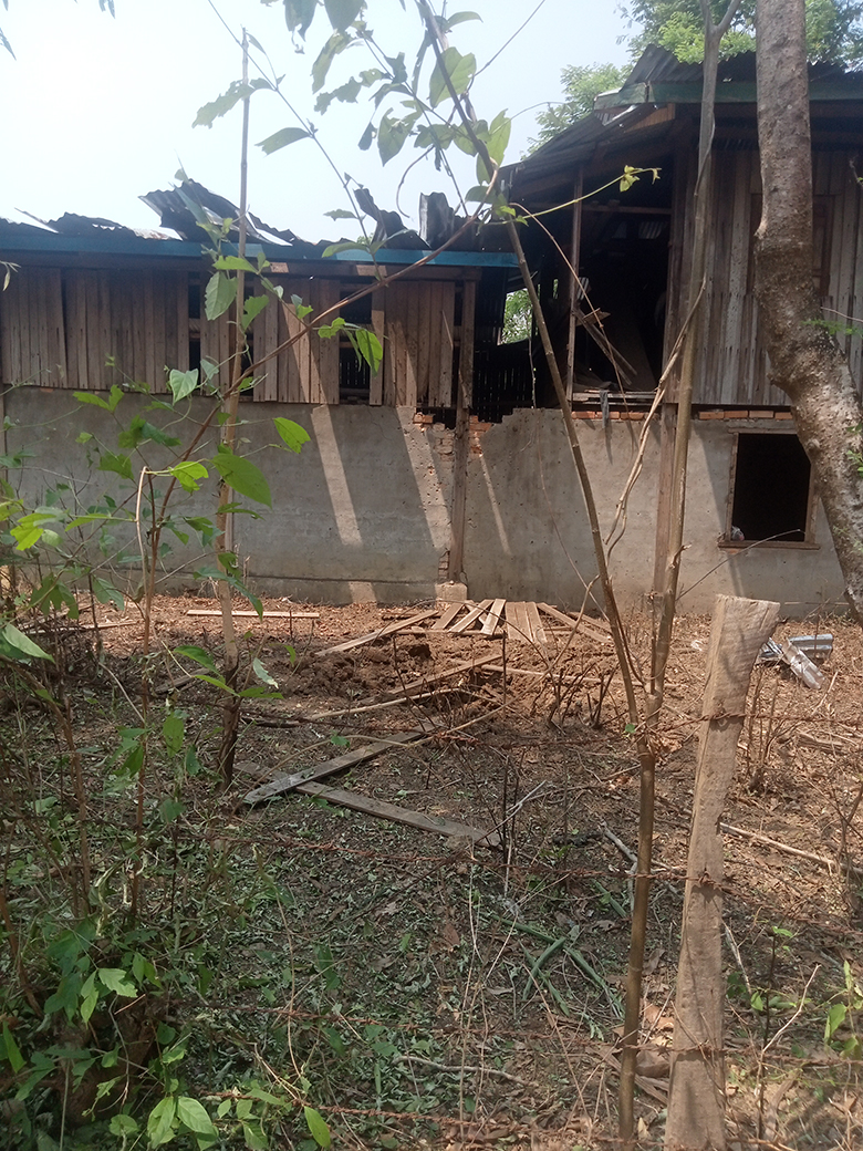 Among these 28 bombs, five bombs landed on the monastery compound in Aa--- village and damaged the monastery wall, the kitchen wall, and the dining room roof. Furthermore, the bombs explosions damaged nearby villagers’ houses, including the house wall of a villager named Saw[7] A--- and the water tank and toilet of a villager named Saw B---. Three bombs landed on Saw C---’s garden, which is next to the house of Saw D--- and the house of Saw E---. The explosions damaged the roof and wall of Saw D---’s house. Saw E---’s house was destroyed by the explosion. Three bombs landed beside the house of Saw F--- [but did not damage the house]. Three bombs landed behind Saw G---’s house and damaged his house roof, a pot, and killed one chicken. The rest of the bombs landed on farms and plantations in Aa--- village area.