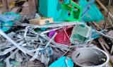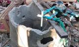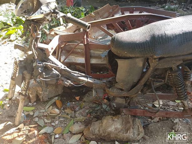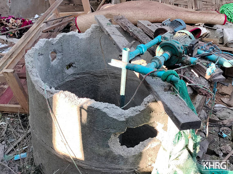 These photos were taken in December 2024 in I--- village, P’Saw Loh village tract, Daw Hpah Hkoh Township, Taw Oo District. On December 12th 2024, SAC soldiers from Shel Chauk Maing (Yay Pu San) village conducted shelling into I--- village, destroying the houses and property of three villagers. The two photos on the top row show the house of a villager named U J---, which was destroyed by the mortar explosion. The photo on the bottom left shows U J---’s electric motor for a water pump, which was destroyed by the explosion. [Photos: KHRG]