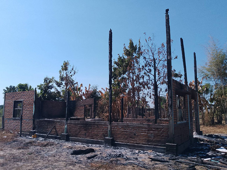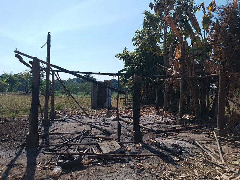 KHRG received these photos from a local villager from Way Htoo village tract, Daw Hpah Hkoh Township, Taw Oo District, in January 2025. The photos show some villagers’ houses in C--- village, Way Htoo village tract, burned by SAC soldiers on January 4th and 5th 2025, after a skirmish with PDF troops on the previous day. The SAC burned more than 30 houses in C--- village. [Photos: A local villager]