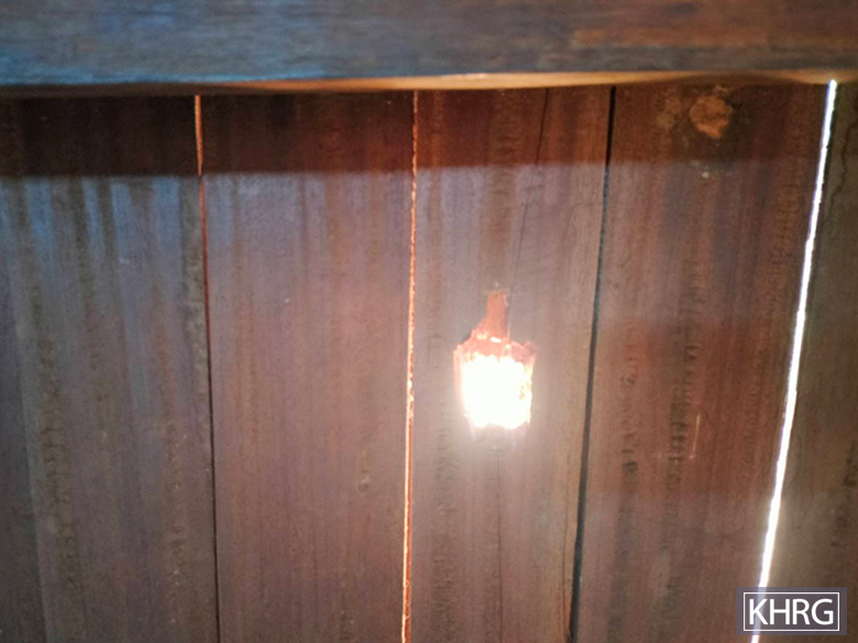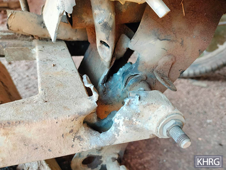 The mortar shell that landed in the village exploded in front of the house of Saw D---. The mortar shell damaged the house and household materials, such as a big plastic bottle containing rice [which weighted 10 viss[6]], cooking pots, and the house’s zinc roof, wooden floor, ladder, and bamboo wall. A betel nut tree, a mango tree, and a papaya tree owned by Saw D---, as well as a motorbike owned by his son [Saw K---], were damaged. The shrapnel also hit and injured Saw D---’s dog, on the leg.