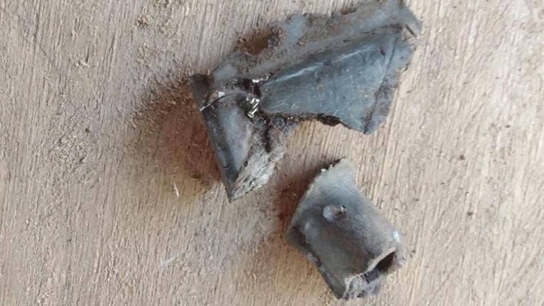 These photos were taken by a KHRG researcher in January 2025, in P--- village, Paw Hkloh area, K’Ser Doh Township, Mergui-Tavoy District. On January 7th 2025, an SAC fighter jet dropped nine bombs on P--- village, causing damage to a villager’s house, a nursery school, and villagers’ plantations. Two villagers were also injured. The photo on the top left shows the damaged house. The photo on the top right shows the damaged school. The two photos in the middle row show the damaged plantations. The two photos on the bottom row show the shrapnel pieces of a bomb dropped by the SAC. [Photos: KHRG]