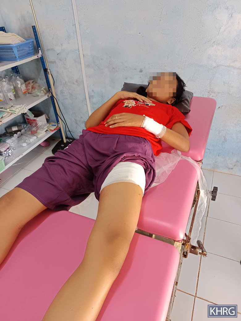 As soon as she was injured, she was sent to the Ac--- clinic, in Noh Kay village tract, and she arrived at the clinic at 6 pm. The healthcare workers checked and cleaned her injury. They said that the shrapnel was stuck deep inside [her thigh] and worried that it could not be removed, so she [the victim] was transferred to the Ad--- clinic the next morning for treatment. [There,] the health worker checked her injury and took out the shrapnel. [Ad--- clinic is administered by KDHW, so the cost of treatment is not high.]