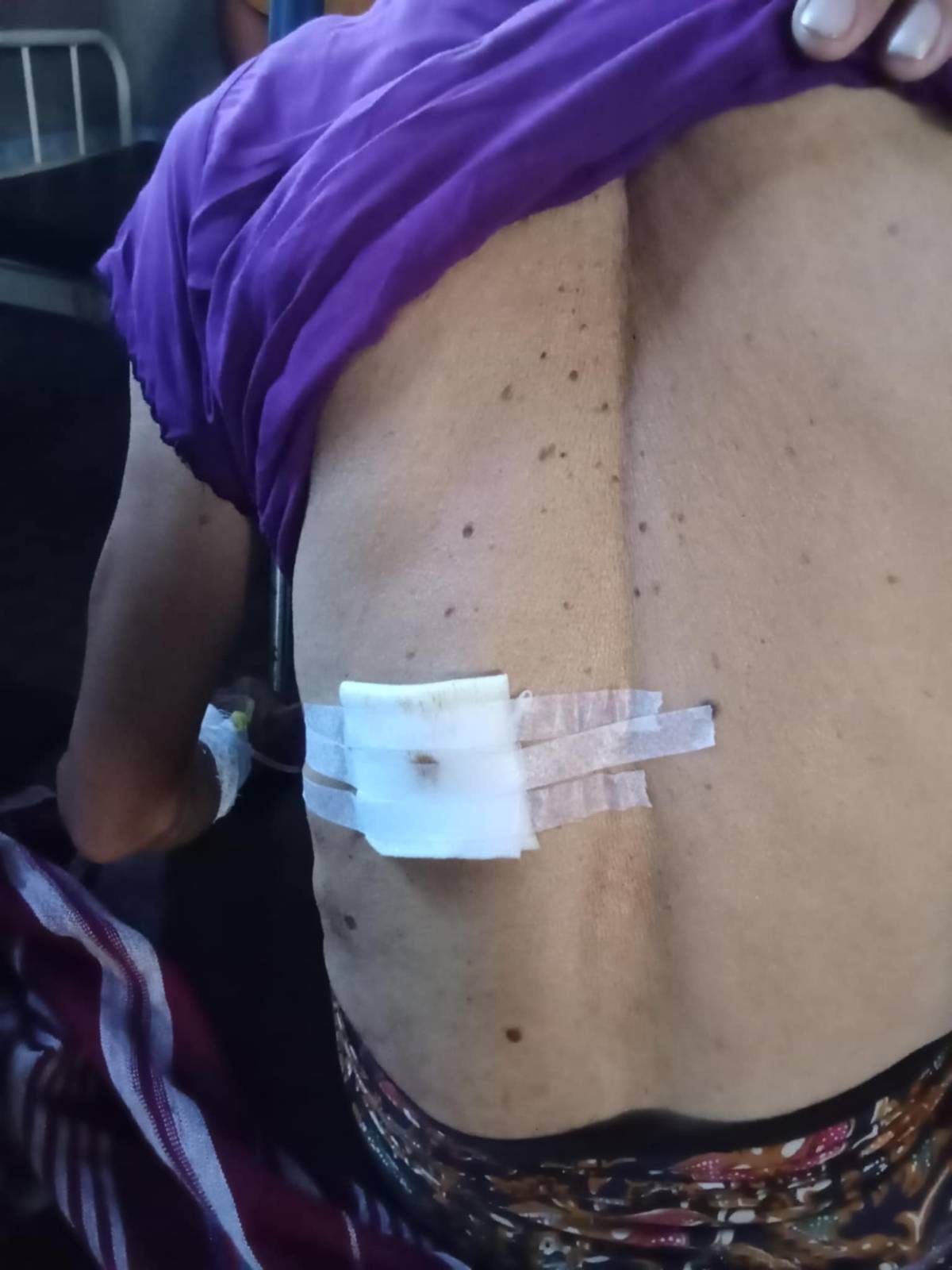 These photos were taken by local villager on November 26th 2024, in Ad--- clinic, Noh Hkwee village tract, Ta Kreh Township, Hpa-an District. On October 27th 2024, at around 3 pm, Burma Army soldiers shelled a mortar round into Ab--- village, Yaw Kuh village tract, T’Nay Hsah Township, and injured a 63-year-old woman named Daw A--- on her lower back. These photos show Daw A--- receiving treatment in Ad--- clinic. [Photos: Local villager]
