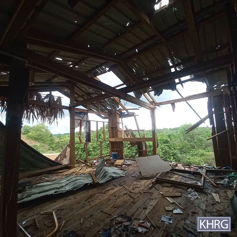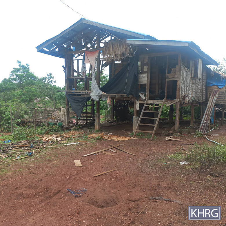 These pictures were taken in June 2024, in Aa--- village, Hk’Rweh village tract, Kyeh Htoh Township, Doo Tha Htoo District. On June 2nd 2024, SAC Artillery Unit #310, under LID #44, shelled around 30 mortar rounds into several villages in Hk’Rweh village tract. One mortar shell landed on U A---’s house and the house was destroyed. These photos show the damage to U A---’s house. [Photos: KHRG]