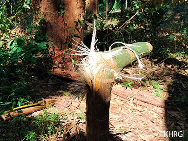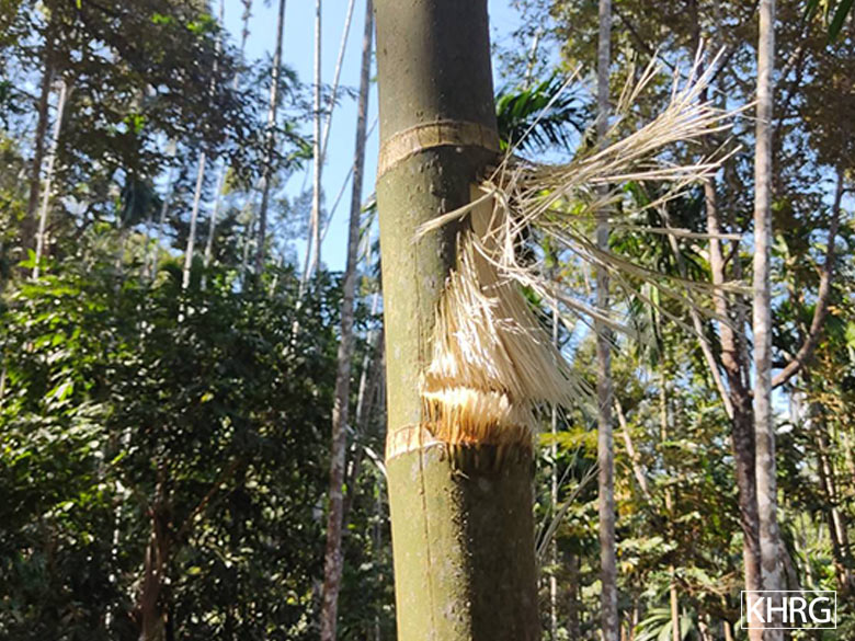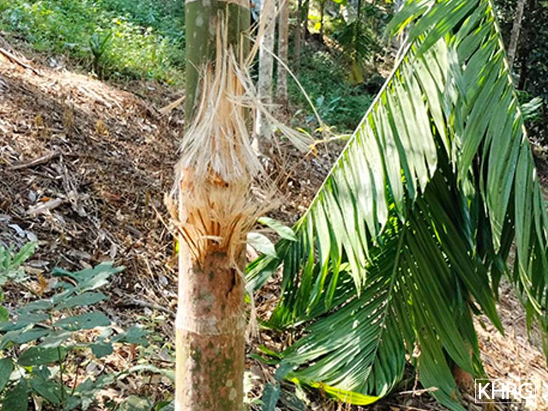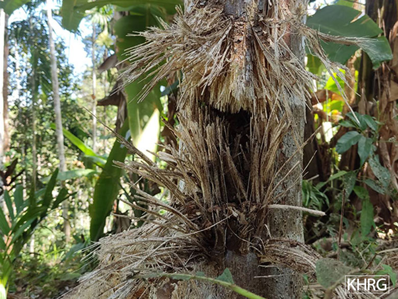 These photos were taken in November 2024 in a betel nut plantation near A--- village, Kaw Thay Der village tract, Htaw Ta Htoo Township, Taw Oo District. It shows some of the betel nut trees, owned by a villager named Saw I---, that were damaged by SAC shelling on November 21st 2024. [Photos: KHRG]
