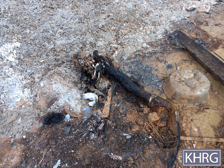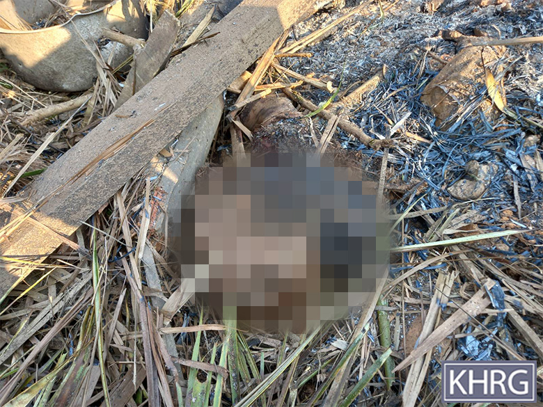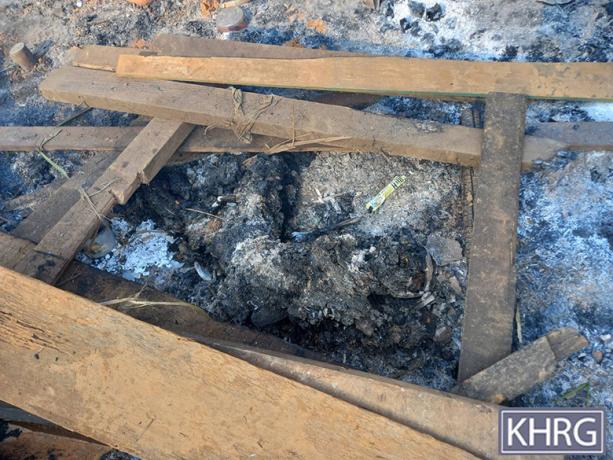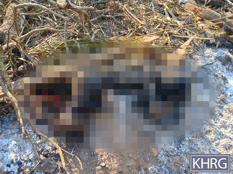 These photos were taken in January 2025 in W--- village, Kyaw Pa village tract, Bu Tho Township, Mu Traw District. These photos show remains of the dead bodies of four villagers who were burned and killed by the air strike conducted by the SAC on January 28th 2025 on W--- village. [Photos: KHRG]