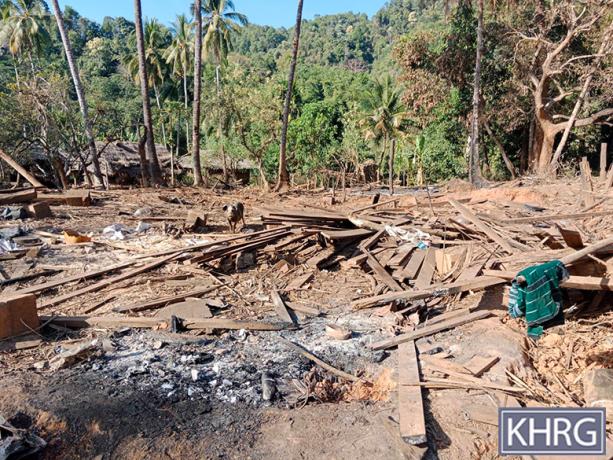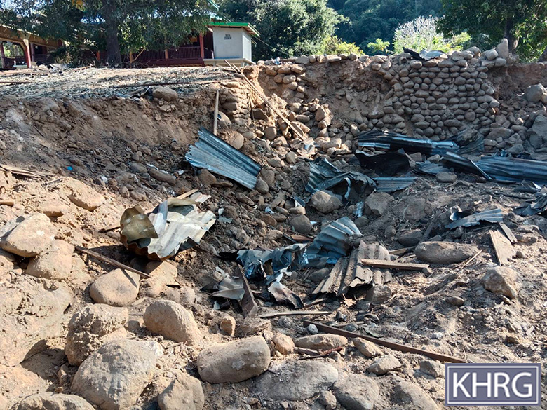These photos were taken in February 2025 in W--- village, Kyaw Pa village tract, Bu Tho Township, Mu Traw District. These photos show the remains of the five houses that were burned down and destroyed by the SAC air strike conducted on January 28th 2025 in W--- village. [Photos: KHRG]