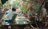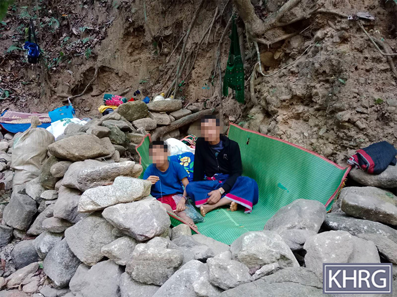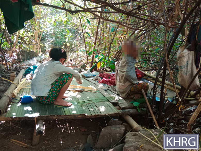 These two photos were taken in February 2025 in the forest near R--- village, Kyaw Pa village tract, Bu Tho Township, Mu Traw District. These photos show displaced R--- villagers. They are staying in the forest due to the SAC air strike that happened on January 28th 2025 in R--- village and on the nearby W--- village. [Photos: KHRG]
