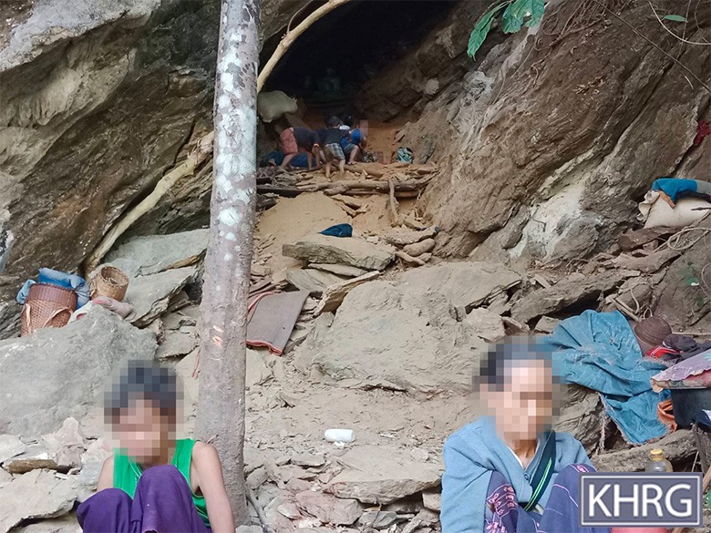 These photos were taken in February 2025 in a forest near W--- village, Kyaw Pa village tract, Bu Tho Township, Mu Traw District. These photos show W--- villagers displaced due to the SAC air strike that happened on January 28th 2025 in W--- village. In the photos, they are staying at the bottom of a valley and in a cave. [Photos: KHRG]