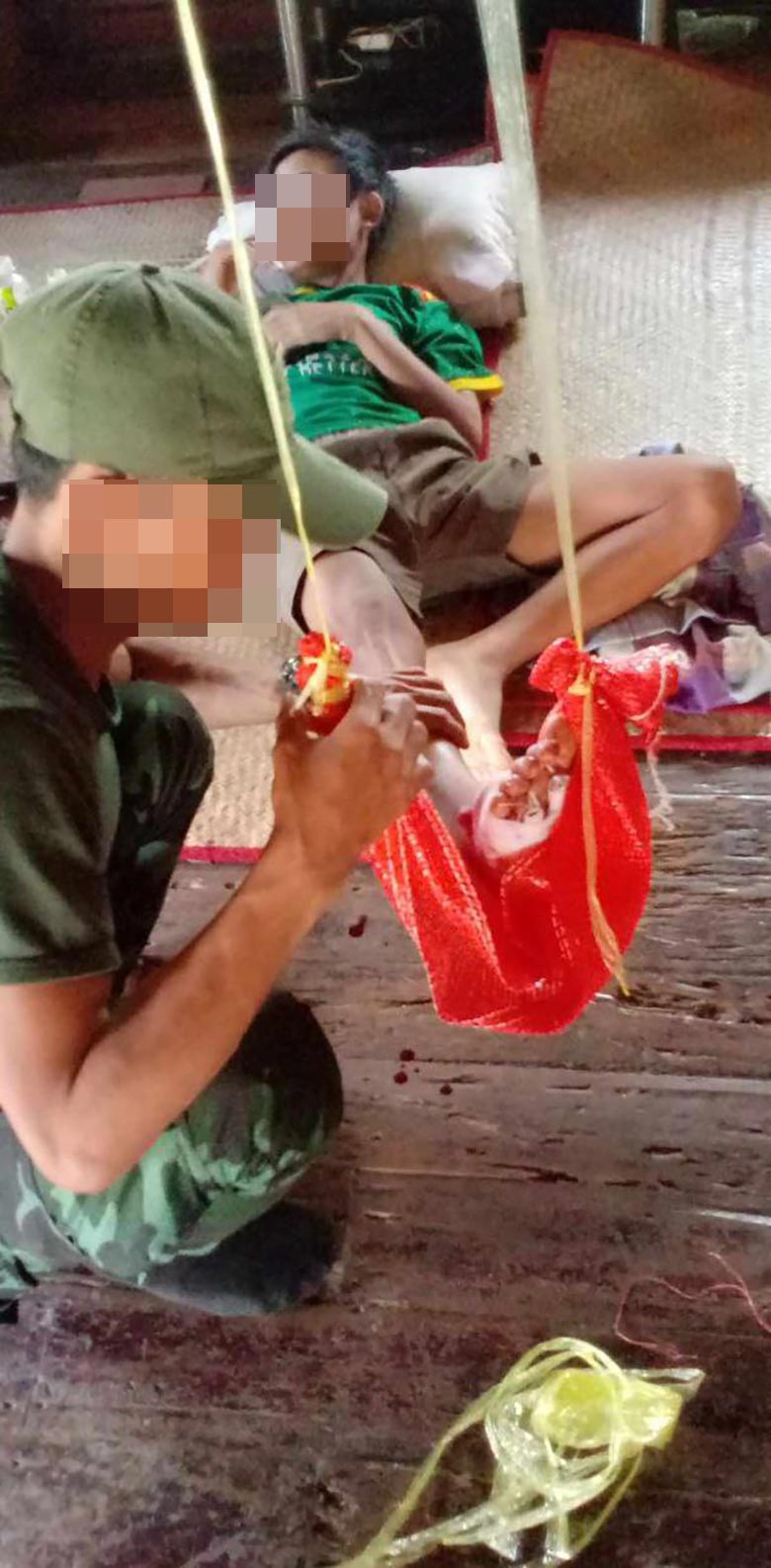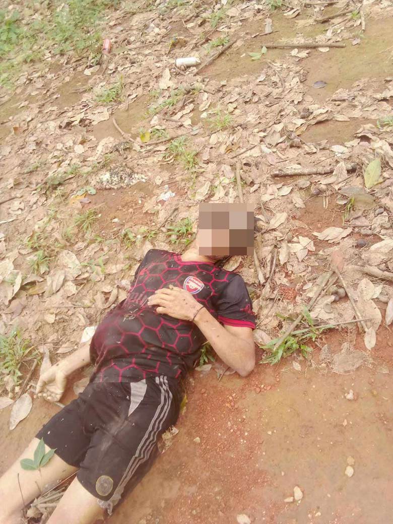 These two photos were received from a local villager on August 6th 2024. On August 5th 2024 two villagers travelled to transport rice packs to local armed resistance forces at the frontline near K--- village, Kleh Muh Htee area, K’Ser Doh Township, Mergui-Tavoy District, and encountered Burma Army soldiers on the way, between 11 am and 12 pm, who shot at them. The 40-year-old villager named Saw A--- died on the spot and the 13-year-old villager named Saw C--- was injured on his left leg but able to escape. The photo at the top shows Saw A---, who was shot and killed by the Burma Army soldiers. The photo on the left shows Saw C---, who was injured on his left leg, receiving treatment by a healthcare worker of the KDHW [Karen Department of Health and Welfare[12]] at Ab--- village, Kleh Muh Htee area, K’Ser Doh Township, Mergui-Tavoy District. [Photos: Local villager]