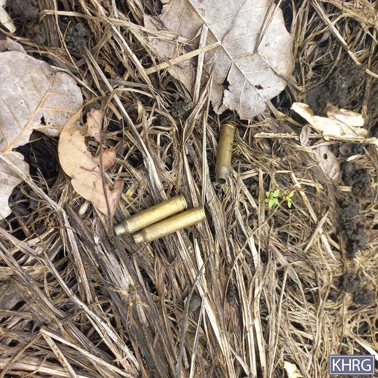 These photos were taken by a KHRG researcher in August 2024, while he travelled to M--- village, Paw Hkloh area, K’Ser Doh Township, Mergui-Tavoy District, for documentation. The photos on the top row show villagers’ plantations that were damaged while fighting broke out between SAC against KNLA Battalions #12 and #27, KTLA, PDF, and others local armed resistance forces. The combined forces ambushed the SAC soldiers when the latter were going back to Dawei Town, from Way Tah Eh Town. The photos on the bottom row show bullet shell casings in the plantations. [Photos: KHRG]