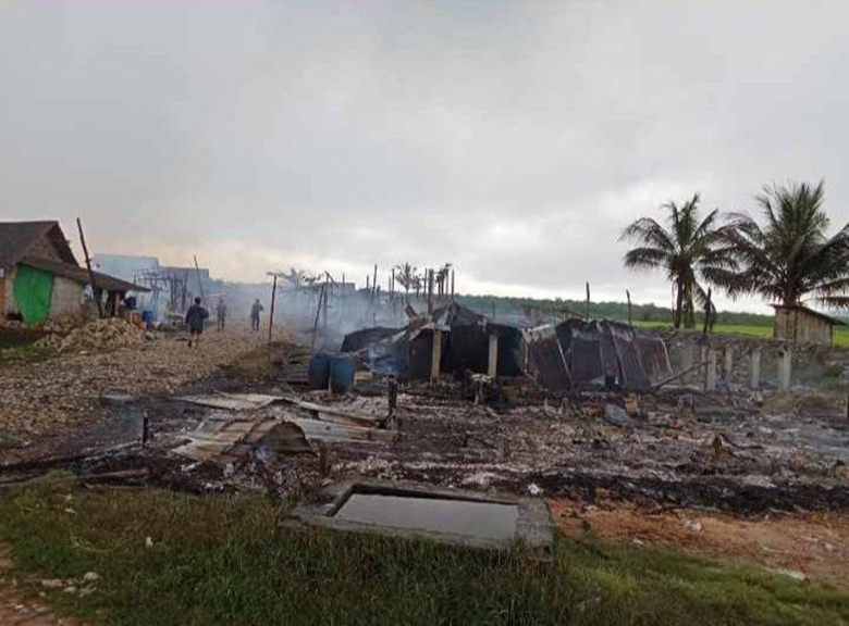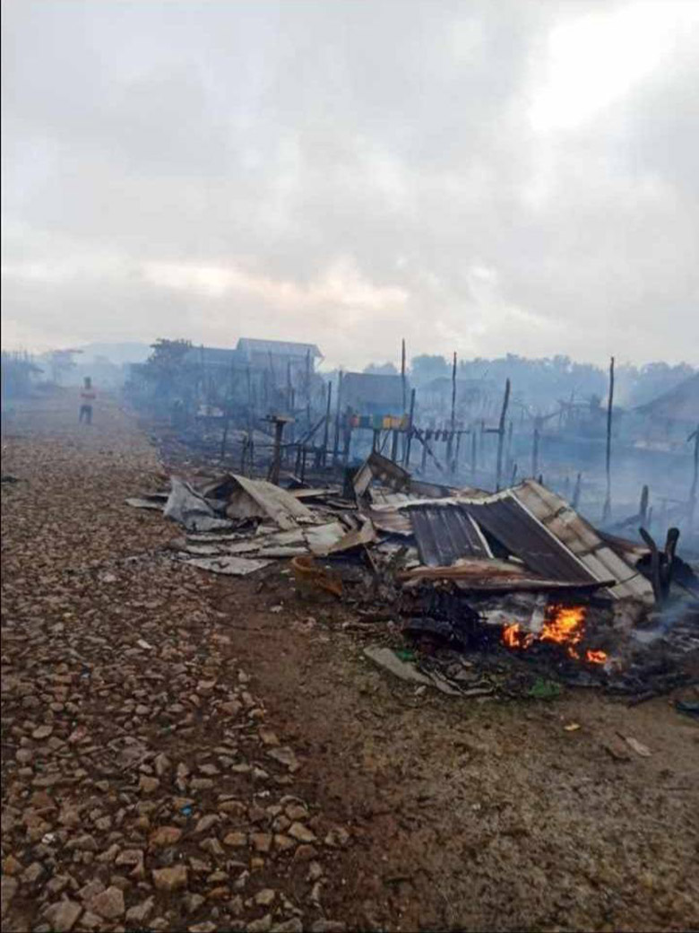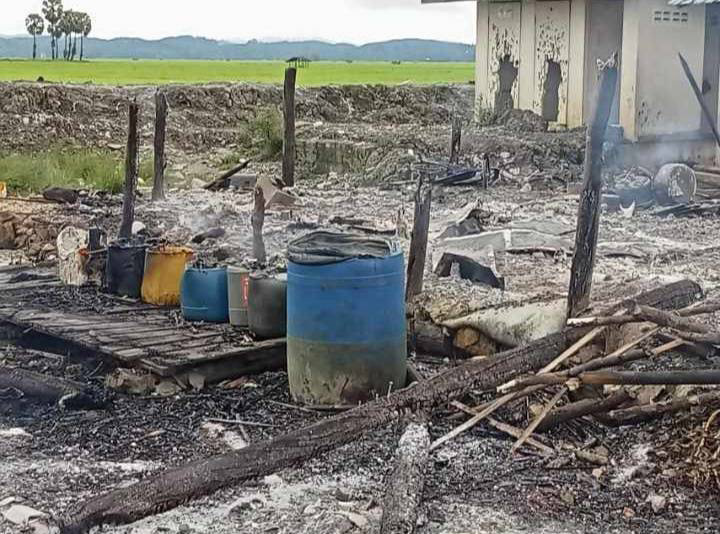 These four photos were received on September 4th 2024, from a local KNU authority who supports displaced villagers voluntarily, from Ip--- village, P’Law area, Ler Muh Lah Township, Mergui-Tavoy District. The photos show villagers’ houses in S--- village, P’Law area, burned down by the SAC on September 19th 2024, after skirmishes occurred in the area with armed resistance groups. Reportedly, one villager also died, burned in the attack. [Photos: Local villager]