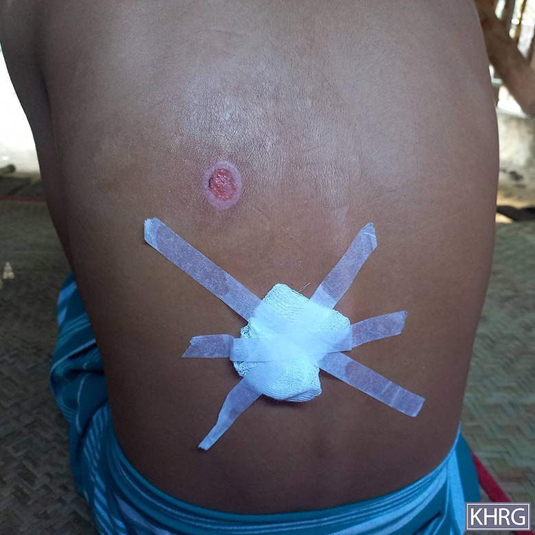 Saw L--- was severely injured on his stomach, back, and left arm. Since he had been hit by mortar shrapnel [on his stomach], his intestines were exposed, and he had to receive surgery. Then, they had to use flesh from his thigh and transfer it to his [left] arm [they carried out a skin graft]. As a result, this student’s body was [mildly] deformed [by his injuries]. 14-year-old Saw L--- explained how he was injured: “After school, I [went home, and then] was going to play football. So, I drove on a motorbike with my friend to get my gloves and socks. My friend was driving the motorbike and I rode on the back. The mortar shells landed as soon as I arrived at the place I was going to [near the headmistress’ house]. Then, I was hit by shrapnel on my stomach, hands, leg, and back. My friend was also injured on his hands and stomach. When my friend and I were hit by the shrapnel, we were knocked off of the motorbike. I cannot remember the exact time we were injured, but it was in the evening. The motorbike was also damaged.” Two villagers who live close to the incident place ran to help the boys. He continued: “Then I was taken to Aa--- hospital for treatment. After I was injured, my teachers also visited me. After the shelling, villagers were afraid, so they fled to another village. I feel upset about my injury. I wish that these kinds of incidents will not happen in my village again.”