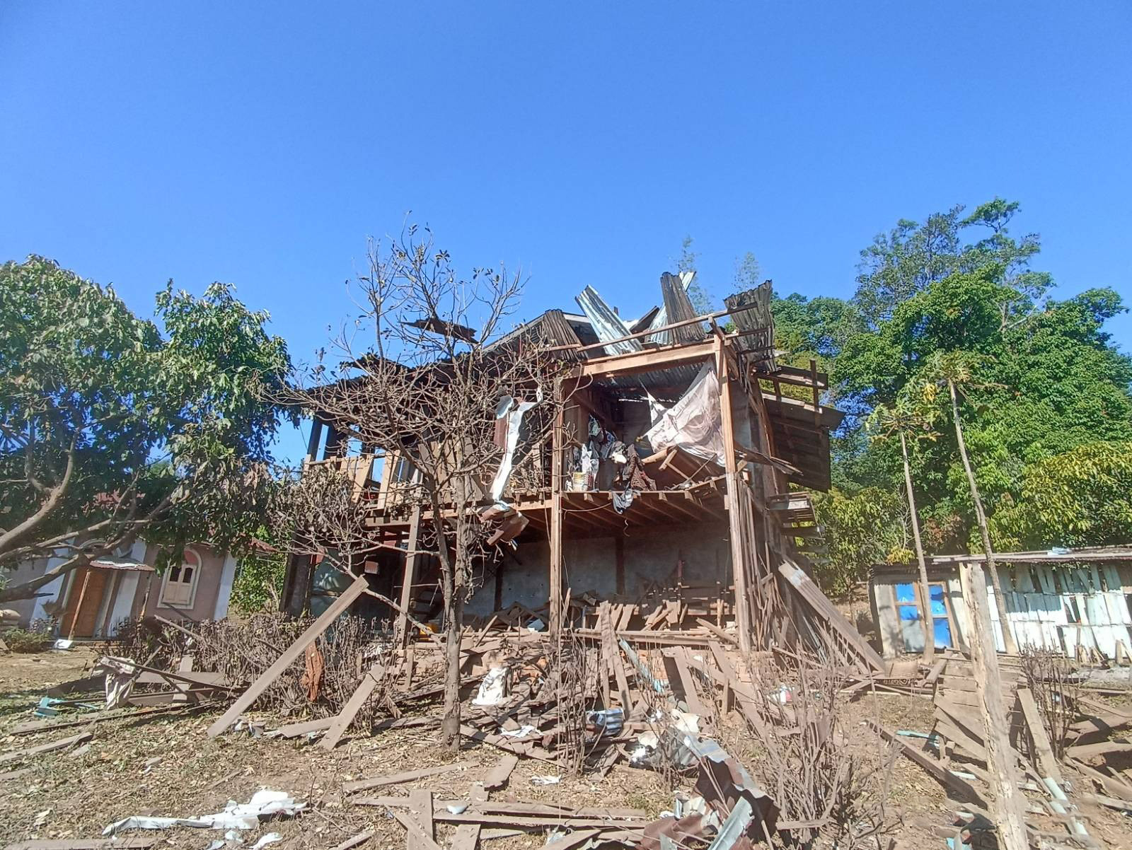 These photos were received on February 4th 2024, from a villager from Af--- village, Ha Thet Poe Le area, Daw Hpa Hkoh (Thandaunggyi) Township, Taw Oo District. On February 1st 2024, at 10:30 pm, three SAC fighter jets conducted an air strike on Af--- village, damaging 14 houses, a church, and school buildings. The photo on the right shows a house owned by a villager that was destroyed, and the photo on the left shows the church that was also damaged by the attack. Before the air strike, SAC soldiers from Ba Yin Naung army camp, in Daw Hpah Hkoh (Thandaunggyi) Town, SAC soldiers from Light Infantry Battalion (LIB)[6] #603, based in Leik Tho Town, and SAC soldiers from Shway Nan Ka Lay Operations army camp, led by Commander Ha Lin Aung, all fired mortar shells into the village and injured one villager. After that, three SAC fighter jets carried out reconnaissance over Af--- village and then conducted air strikes. The attack also damaged a building outside the village where Karen National Liberation Army (KNLA)[7] and People’s Defence Force (PDF)[8] troops were staying. [Photos: Local villagers]